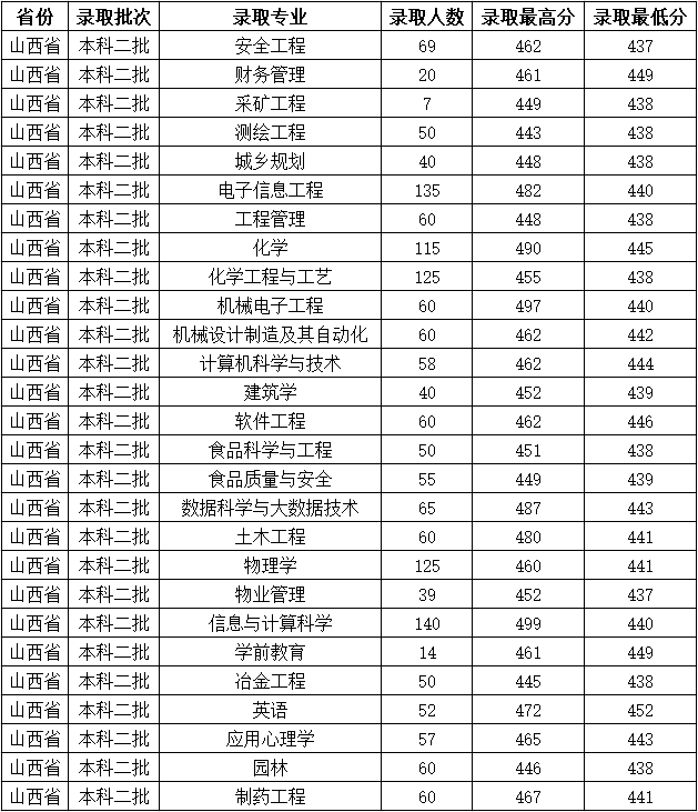 吕梁学院2020年本科二批理工各专业录取情况统计表【山西省】