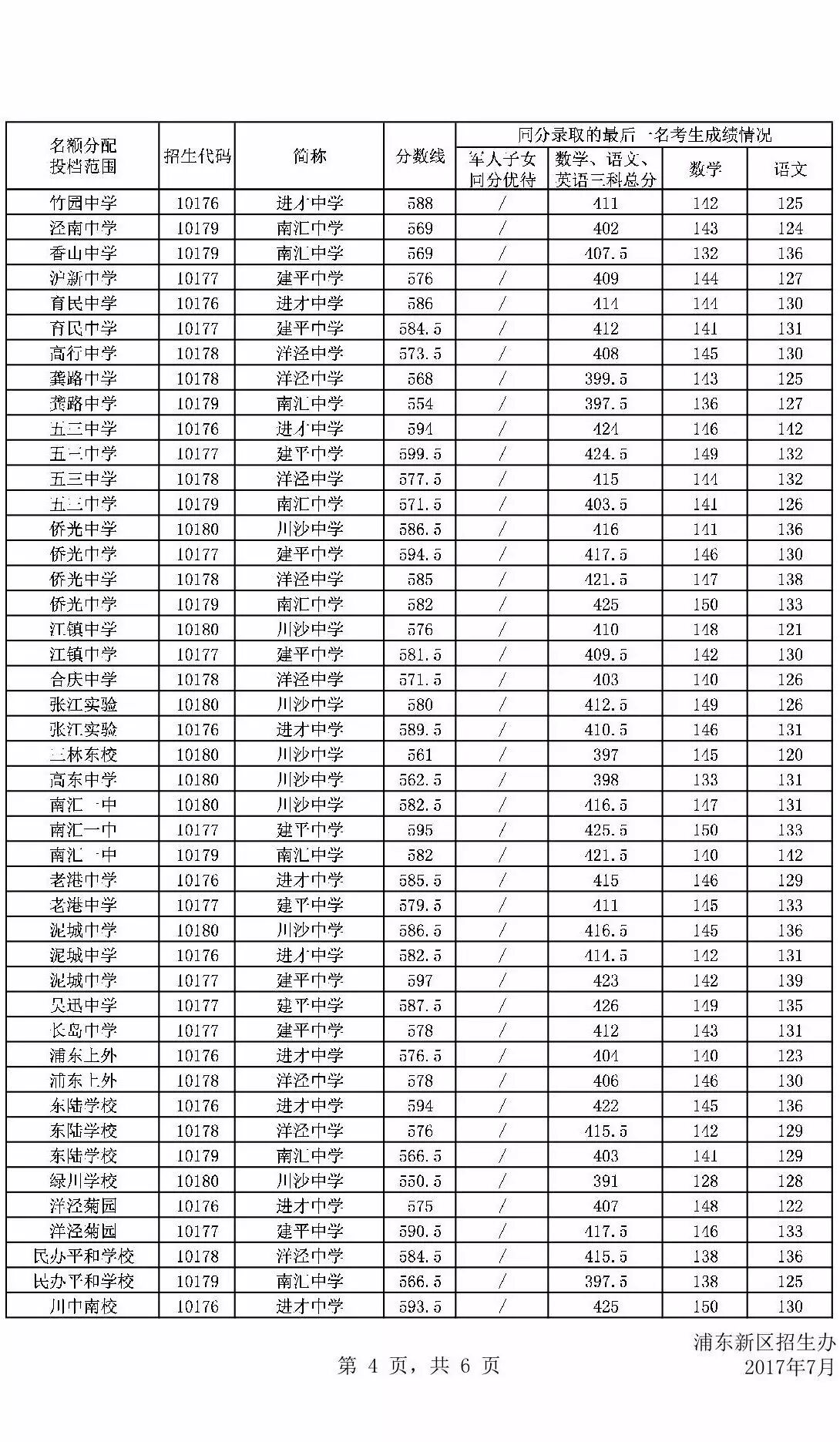 2017上海浦东中考零志愿分数线、名额分配志愿分数线