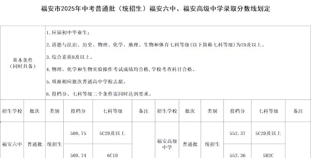 普通批(统招生、国际班)各校录取分数线详情如下:福安市2025年中考普通批(统招生、国际班)各校录取分数线一览
