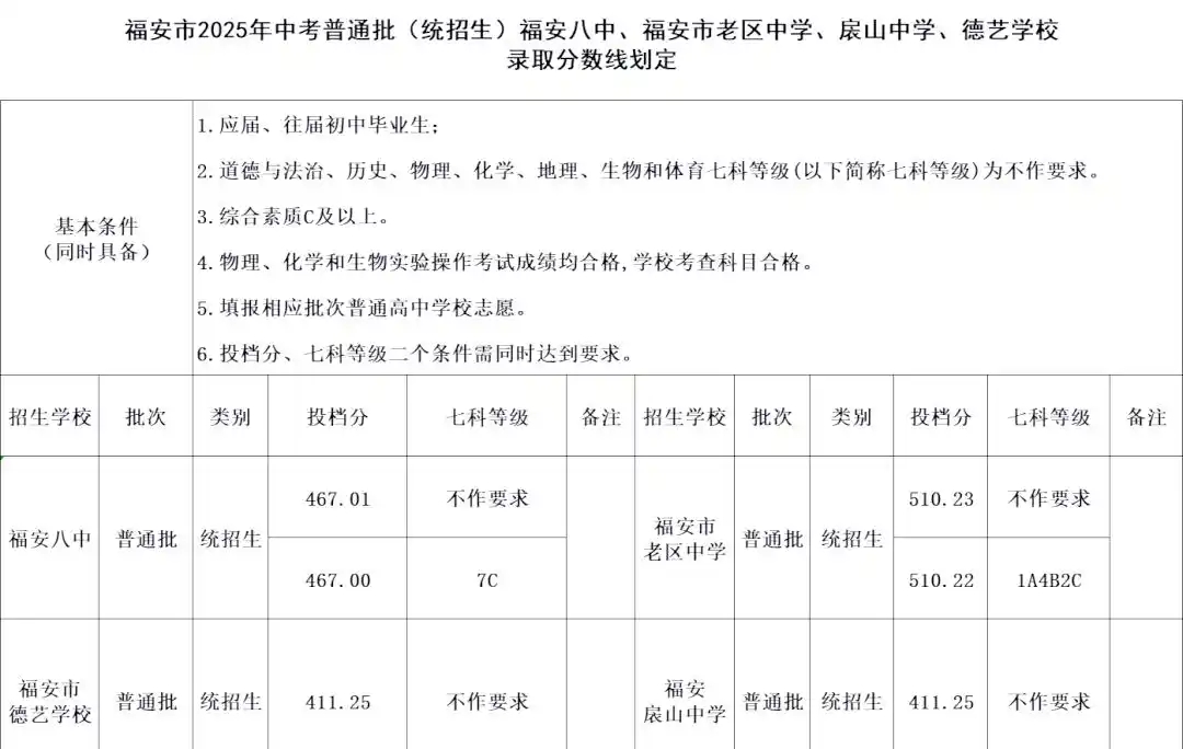 福安市2025年中考普通批(统招生)福安八中、福安市老区中学、扆山中学以及德艺学校的录取分数线已经公布。