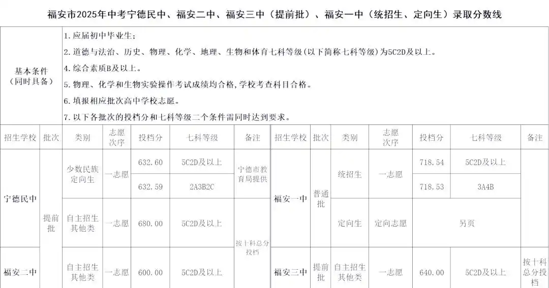 普通批(统招生、国际班)各校录取分数线详情如下:福安市2025年中考普通批(统招生、国际班)各校录取分数线一览
