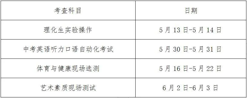 体育与健康现场选测、艺术素质现场测试、理化生实验操作考查由市统一命题,统一考查(测试)时间和要求。海州区、连云区、开发区、云台山景区和徐圩新区的体育与健康现场选测由市教育局统一组织实施,赣榆区和三县分别由所在地教育局组织实施,市教育局负责巡视和督查。体育与健康学习过程评价由考生所在学校负责实施,教育行政部门组织抽查、审核;艺术素质现场测试由所在地县区教育局组织实施,市教育局负责巡视和督查;理化生实验操作考查由县区教育局组织实施,直属初中由市教育局组织实施。