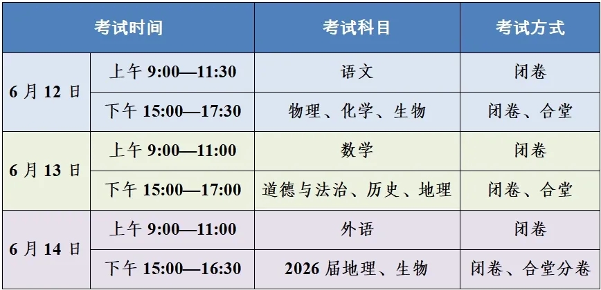 考试时间是6月12—14日,14日下午是初二年级地理、生物考试时间。志愿填报时间是6月15日—6月22日。成绩及录取结果查询与报到确认时间是6月26日—6月30日。统一补录时间是7月2—11日。民办学校补录时间是7月14日—22日。综合高中班录取时间是7月23—31日