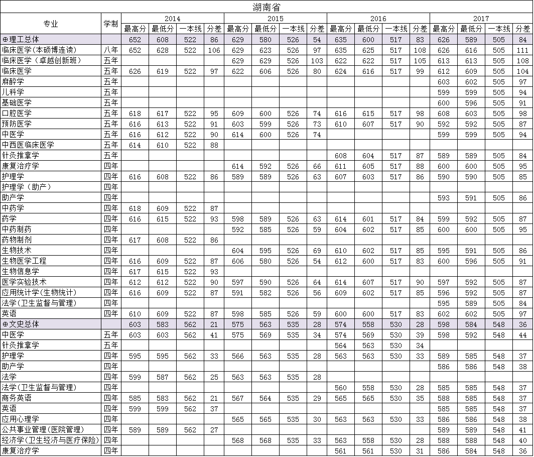 南方医科大学2014、2015、2016、2017年在湖南省分专业录取分数线