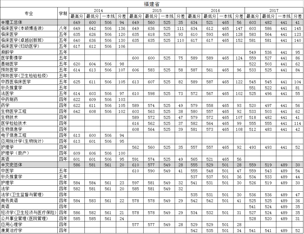 南方医科大学2014、2015、2016、2017年在福建省分专业录取分数线