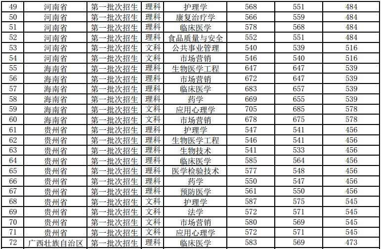 广州医科大学2017年分省分专业录取分数线