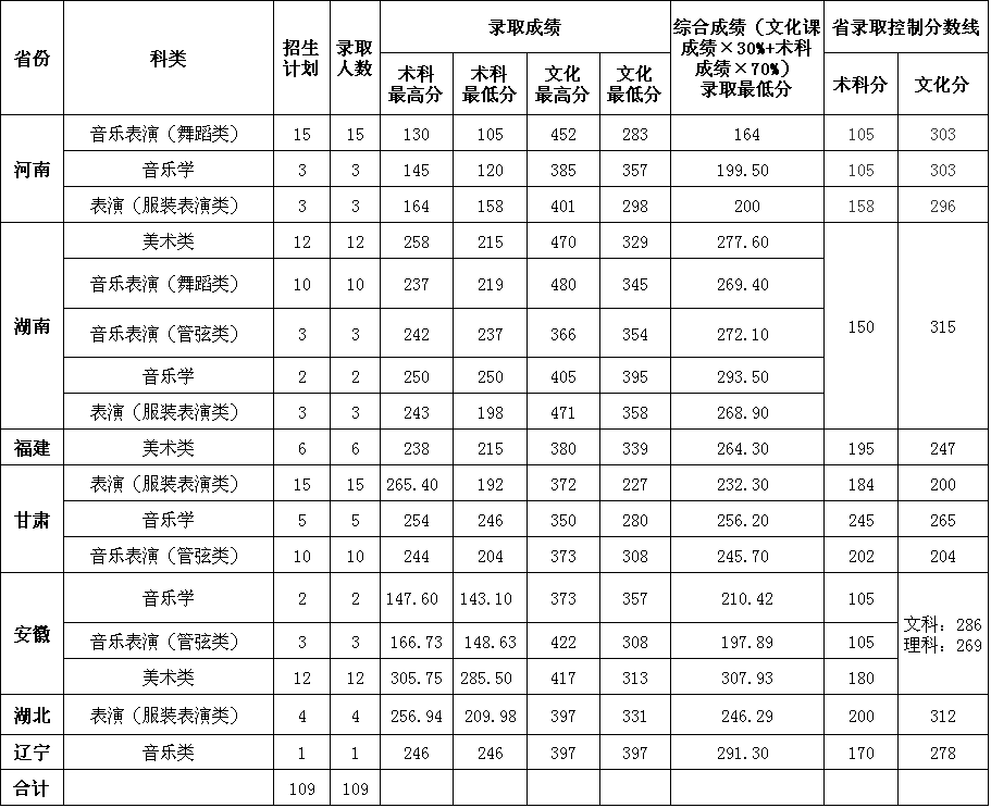 惠州学院2017年普通高校招生艺术类专业录取情况统计表(外省)
