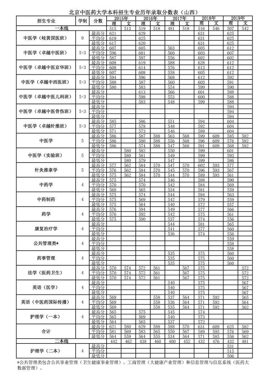 北京中医药大学2015-2019年在山西省各专业录取分数线