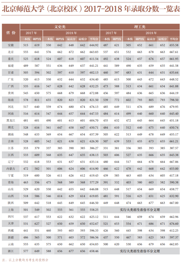 2017-2018北京师范大学录取分数线【全国】