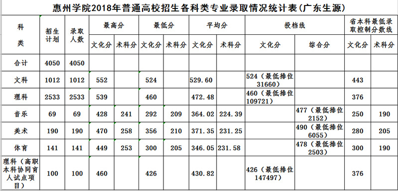 惠州学院2018年普通高校招生各科类专业录取情况统计表(广东生源)