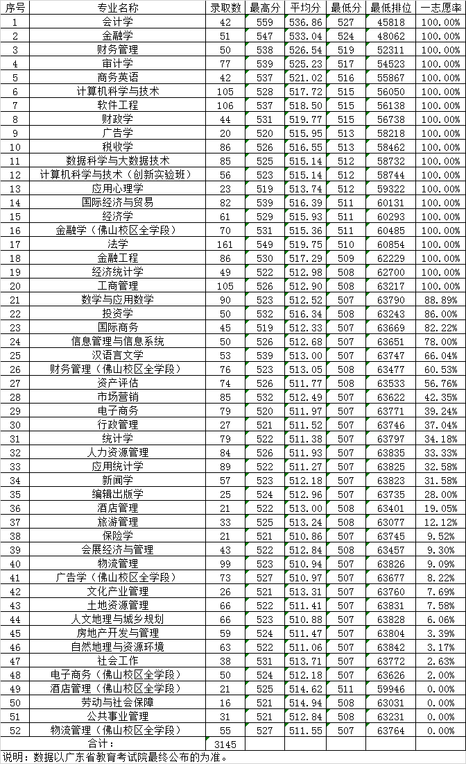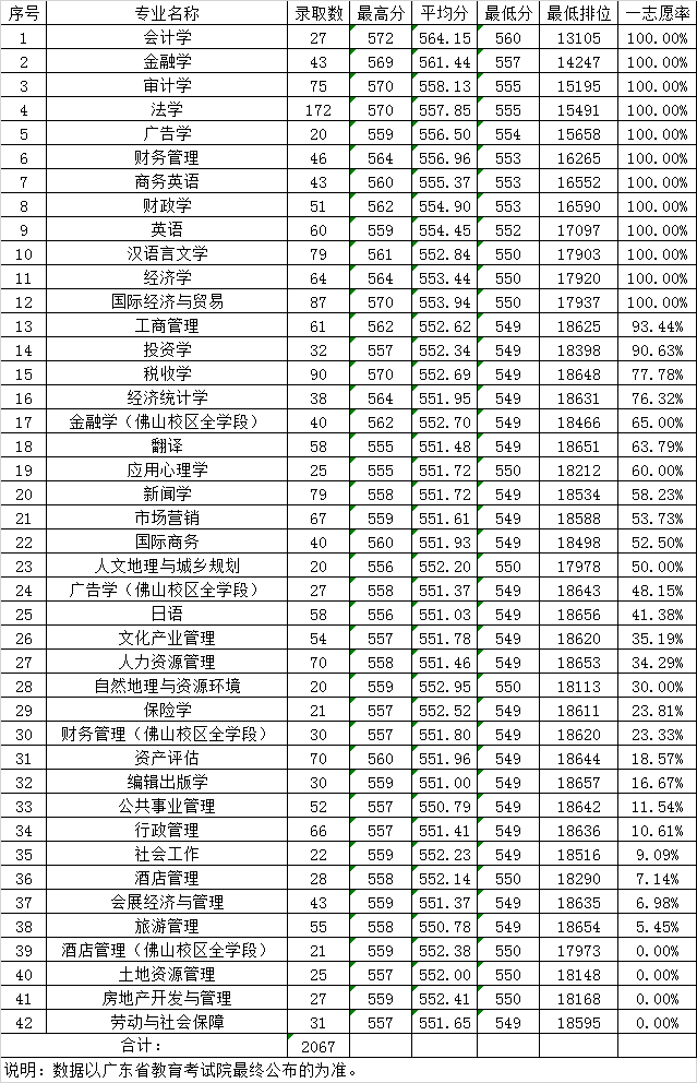 广东财经大学2019年广东省文科各专业录取分数线情况表(普通类)