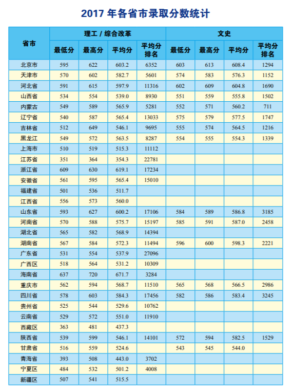 2017年中国地质大学北京在各省各科类录取分数线