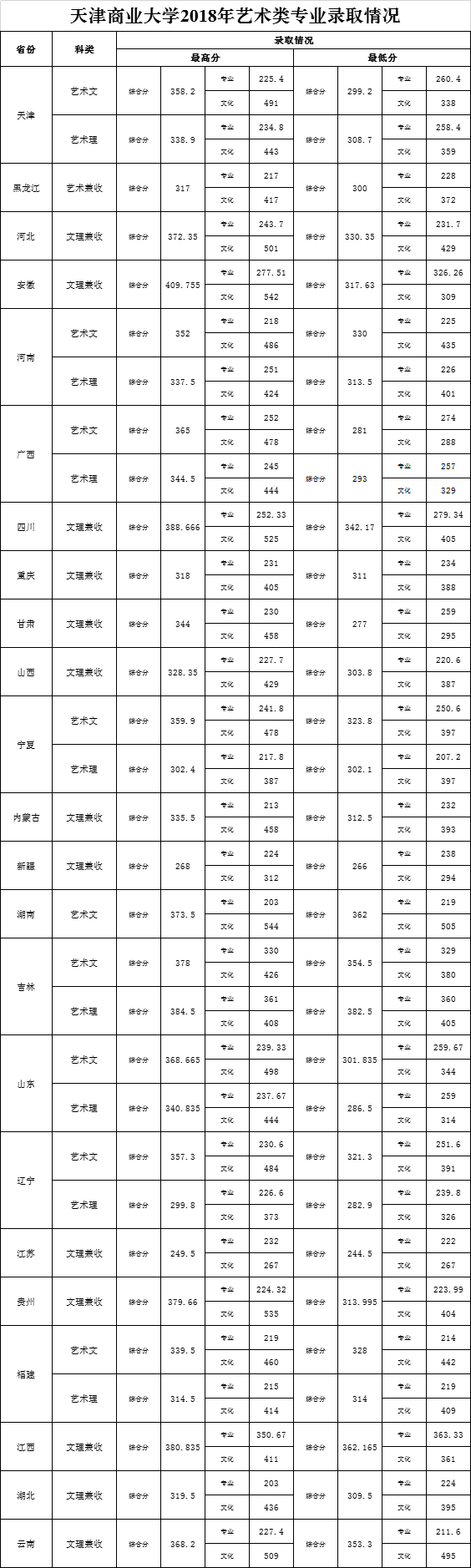 天津商业大学2017-2018年在天津各专业录取情况一览表