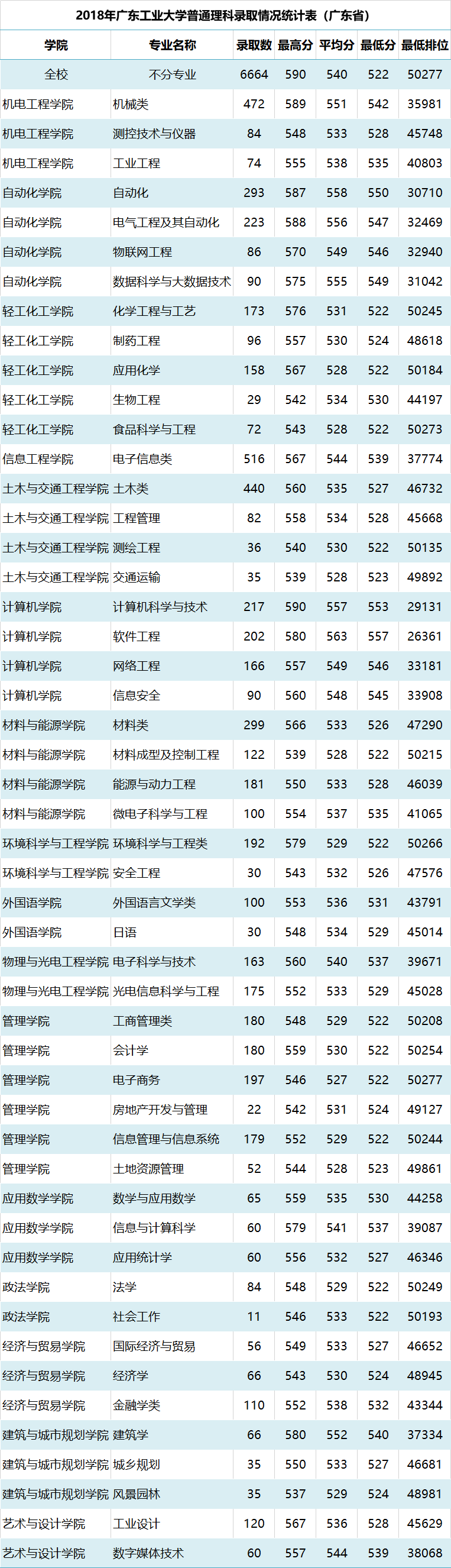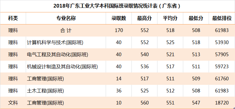 广东工业大学2018年在广东省各专业录取分数线