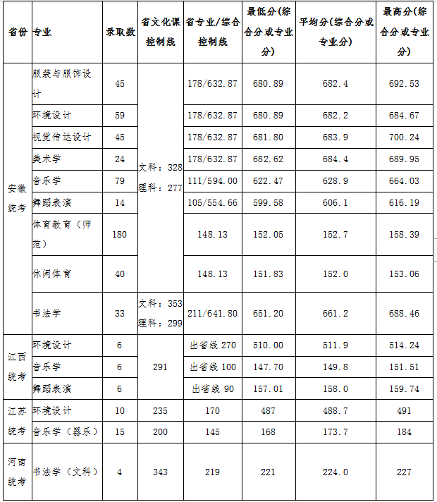 宿州学院2019年艺术、体育类专业录取分数线