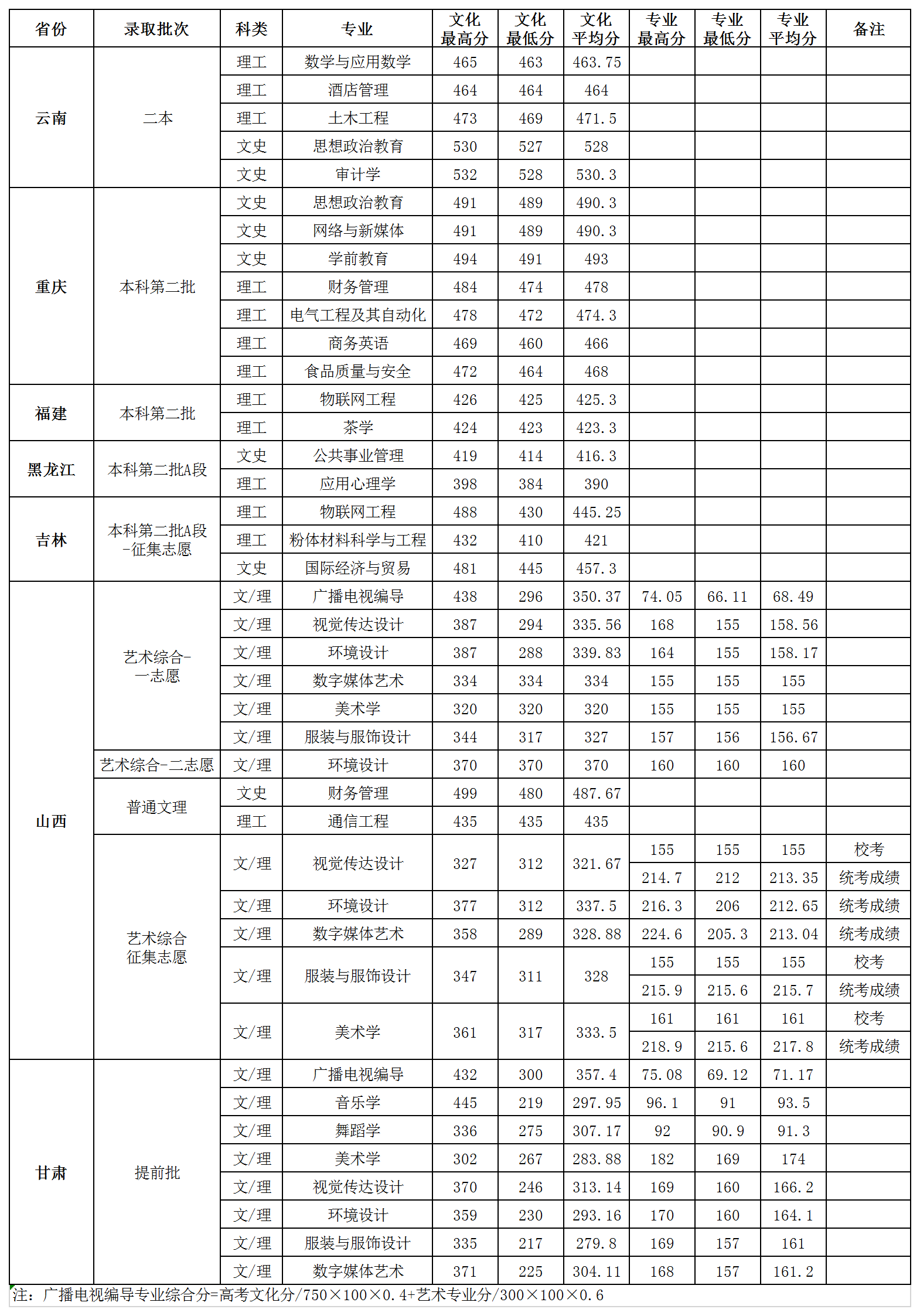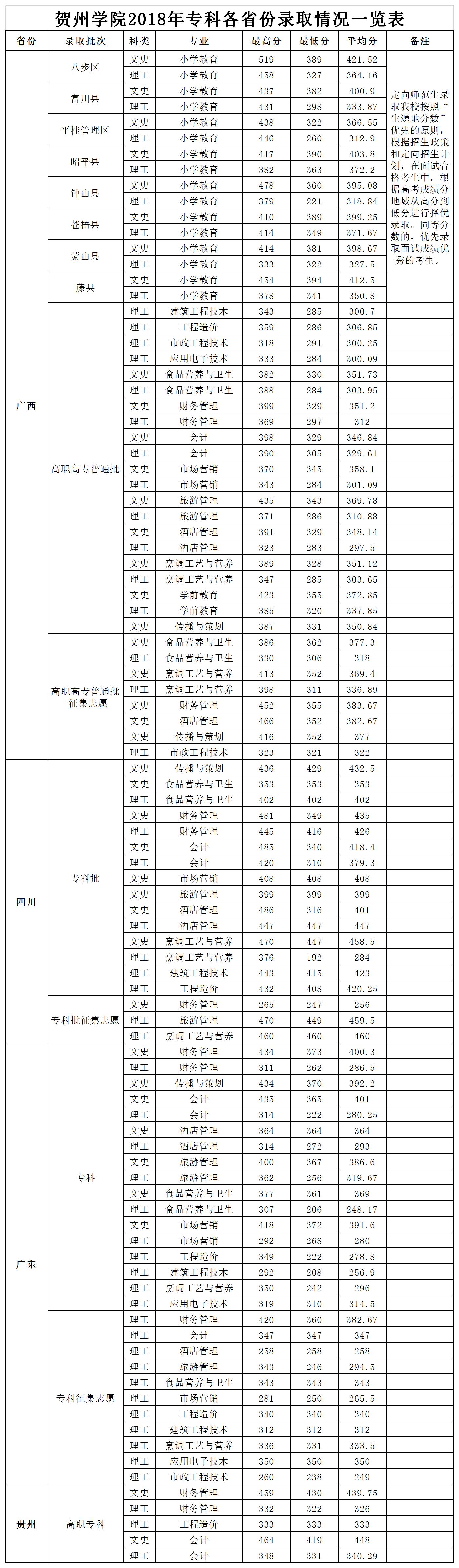 贺州学院2018年专科各省份录取分数一览表