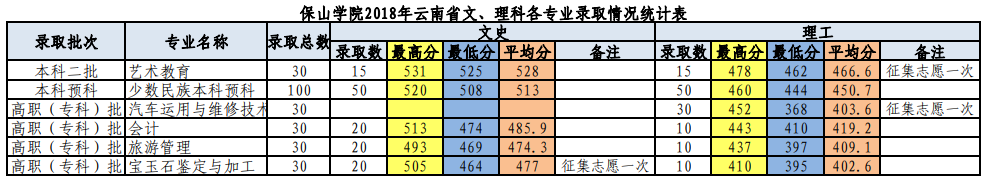 保山学院2018年各招生省份文理科录取情况