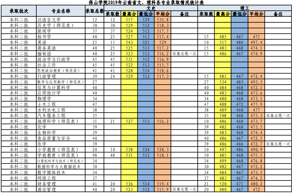 保山学院2019年云南省文理科分专业录取分数线情况(云南)