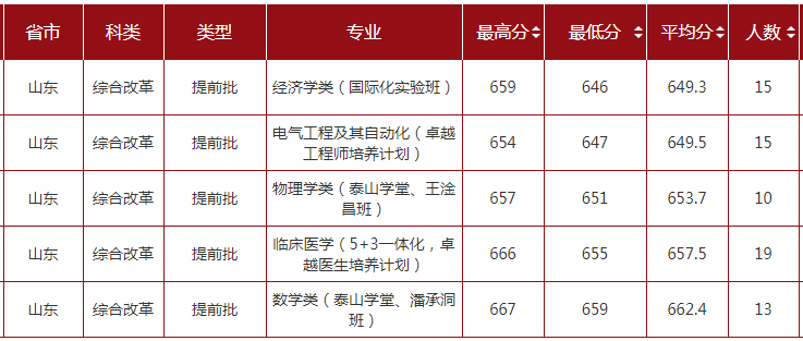 2020年山东省提前批类分专业录取分数线情况