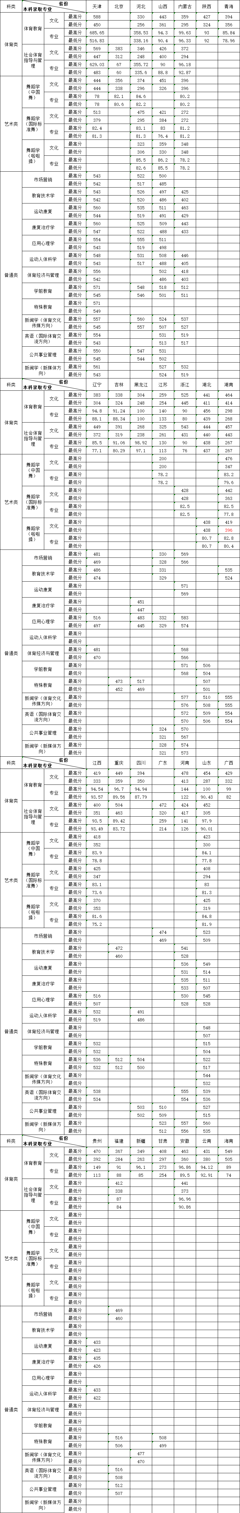 天津体育学院2020年招生分省分专业分数线统计