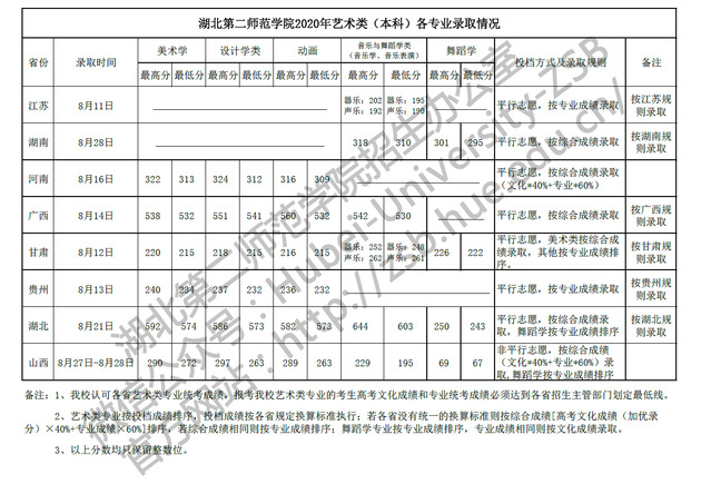湖北第二师范学院2020年艺术类(本科)各专业录取分数线情况