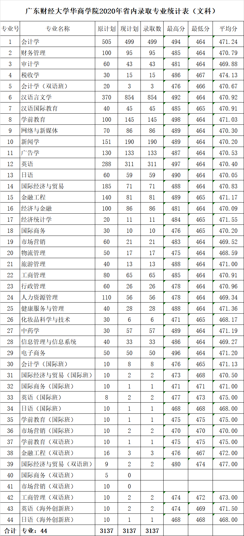 2020广东财经大学华商学院各专业录取分数线【全国】