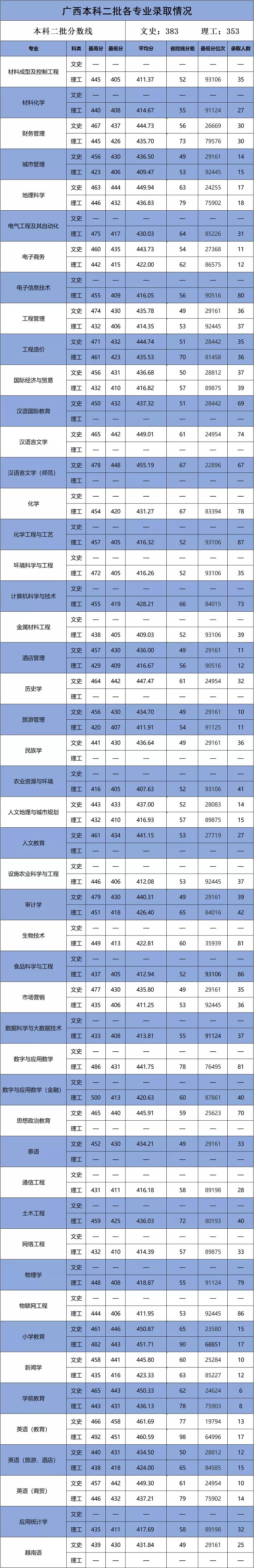 百色学院2020年广西本科二批各专业录取情况