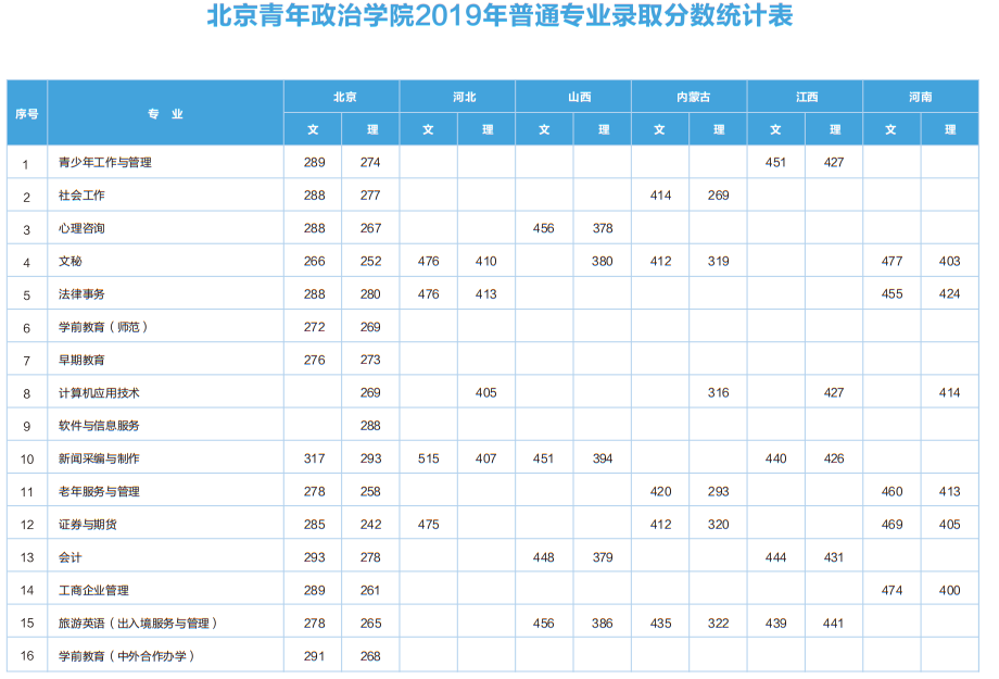 北京青年政治学院2019年统考招生分批次、分科类录取人数及录取最低分