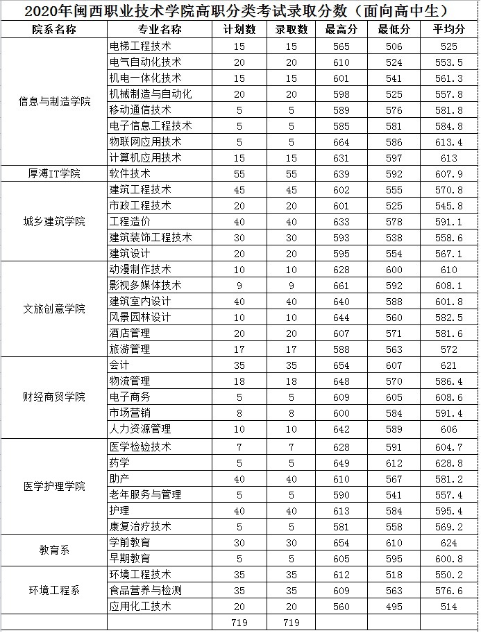2020年闽西职业技术学院高职分类招考(面向普通高中生)招生计划数常规志愿一次性全部录满,总录取人数719人,最高分664,最低分495,平均分583.4。