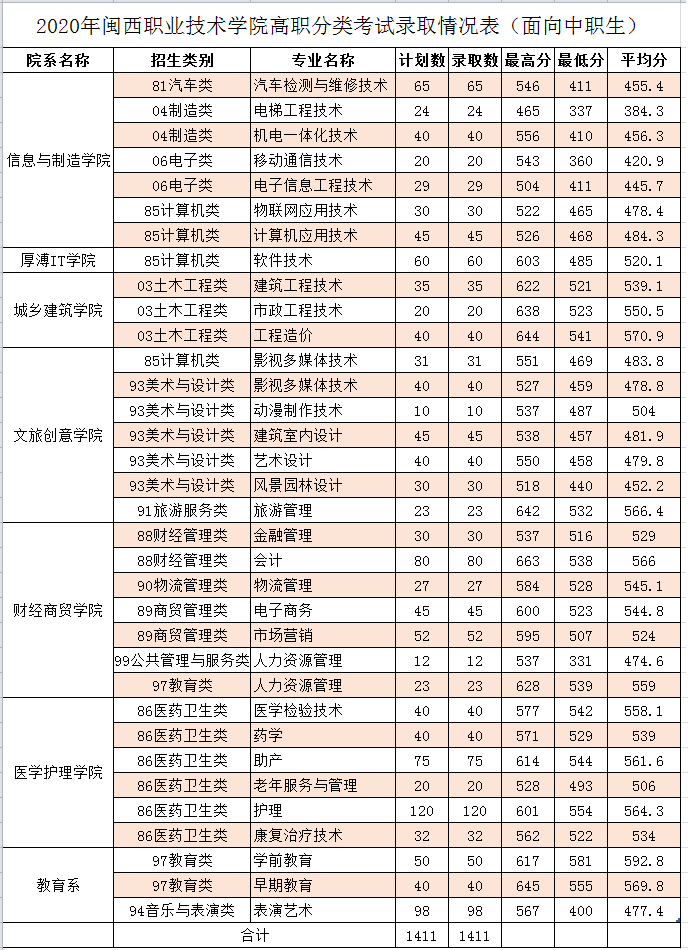2020年闽西职业技术学院高职分类招考(面向中职生)招生计划数常规志愿一次性全部录满,总录取人数1412人(其中机电一体化技术专业招收免试入学1人),平均分518.4。