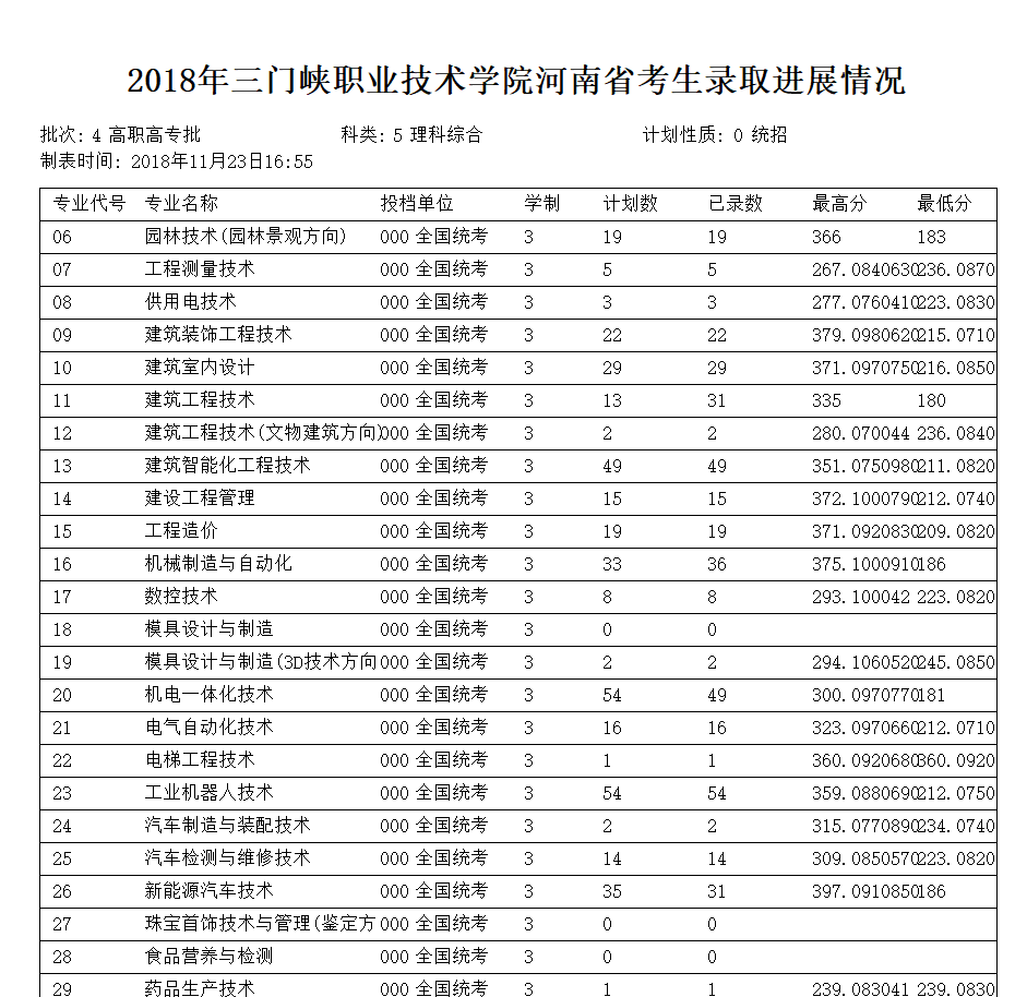 三门峡职业技术学院录取分数线2018