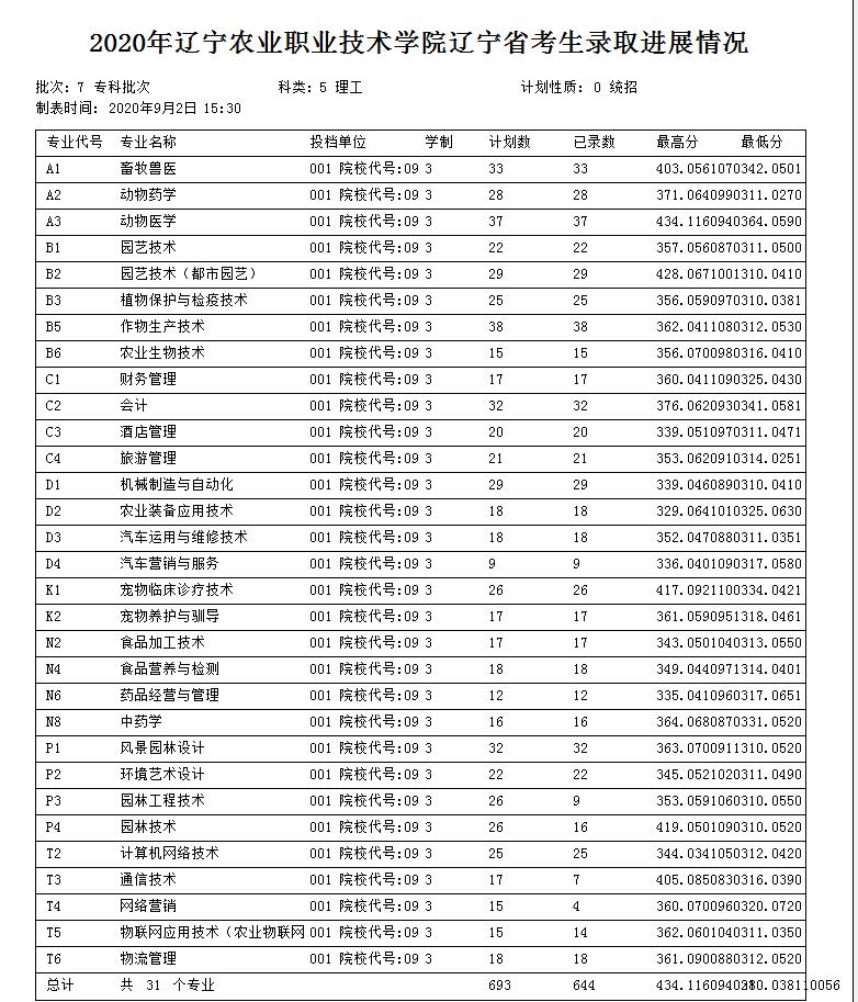 辽宁农业职业技术学院2020年辽宁省高考录取分数线
