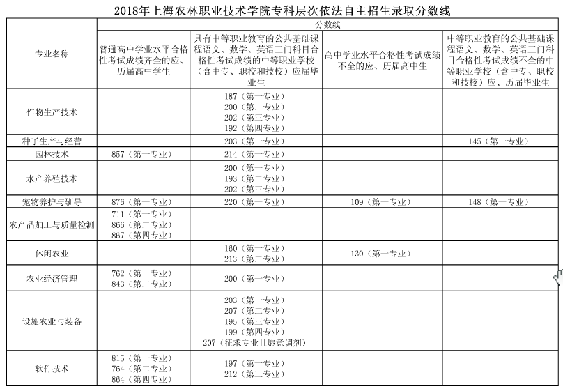 2018年上海农林职业技术学院“三校生”高考录取分数线