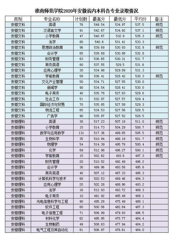 2020年淮南师范学院安徽省内普通文理(含艺体类)各专业录取分数线情况