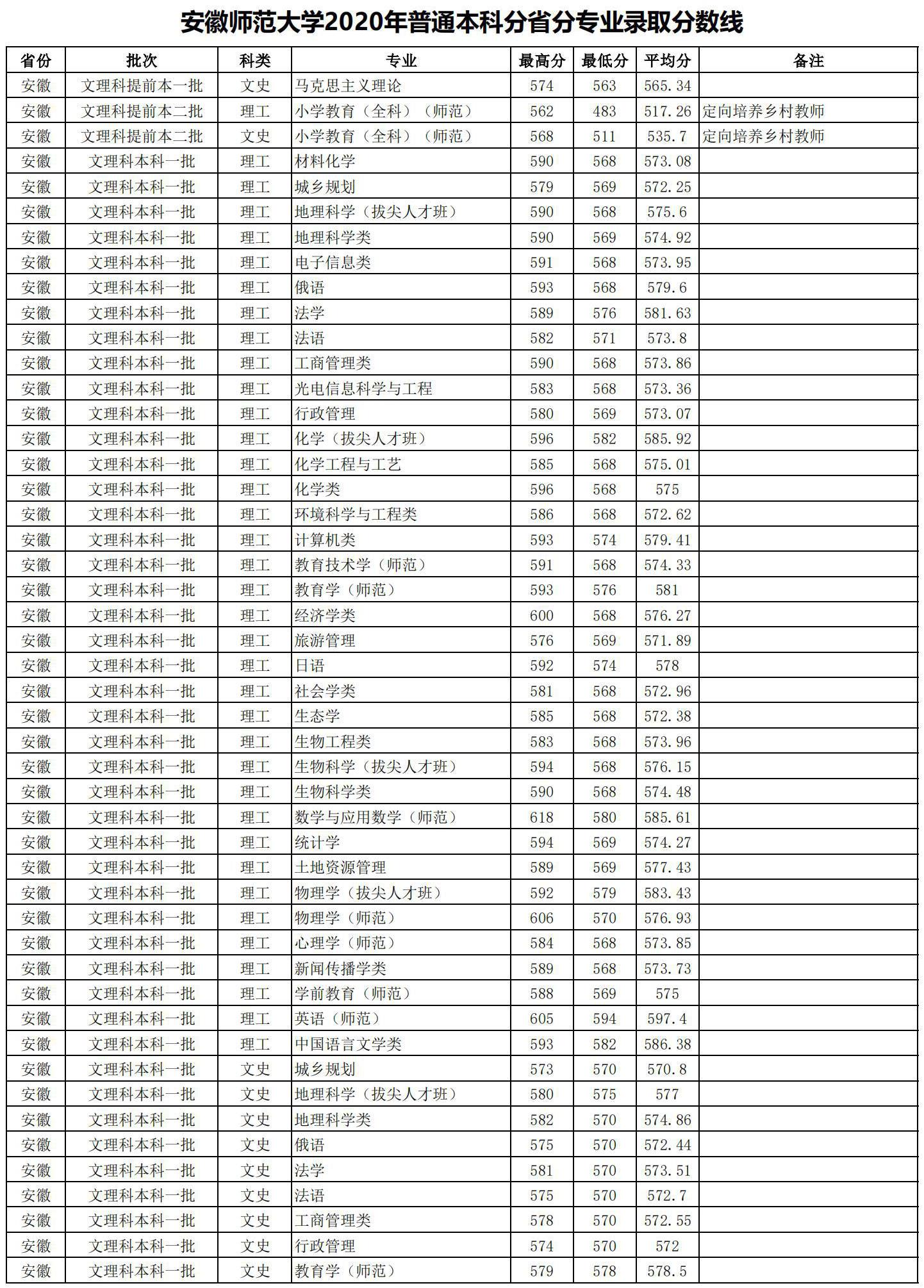 1、2020安徽师范大学录取分数线【全国】