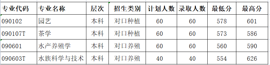 2021年学校对口本科招生计划220人,实际录取220人,其中种植类专业录取120人,最高分601,最低分573;养殖类专业100人,最高分626,最低分554。男生117人,女生103人。汉族218人,回族1人,满族1人。共青团员151人。各录取专业见下表。
