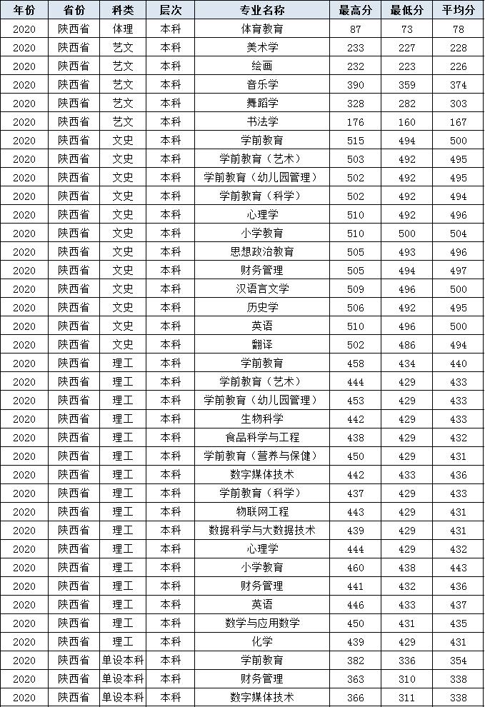 2020陕西学前师范学院各专业录取分数线【陕西】