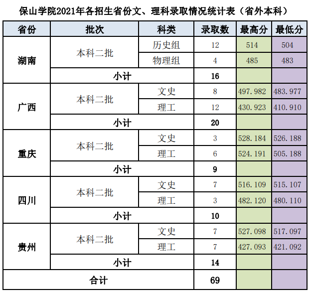 1、2021保山学院录取分数线【全国】