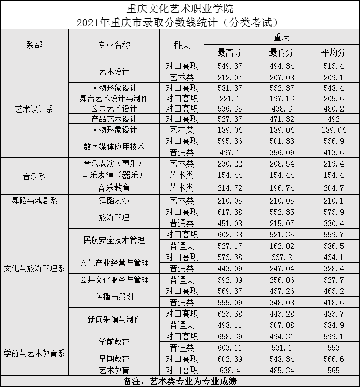1、2021重庆文化艺术职业学院录取分数线【全国】