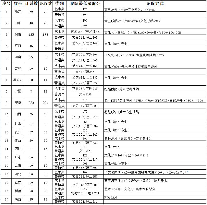| 序号 | 类别 | 专 业 | 最高分 | 最低分 | 省控线文化分 | 美术专业成绩 |
