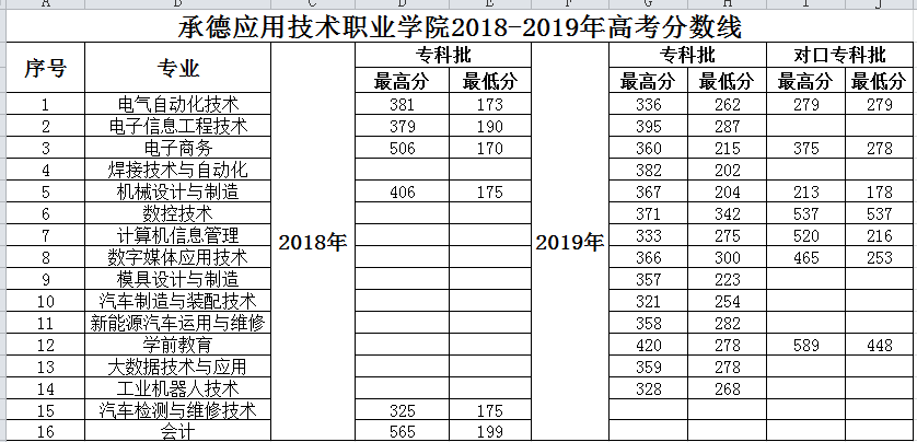 1、2018-2019年承德应用技术职业学院录取分数线【河北】