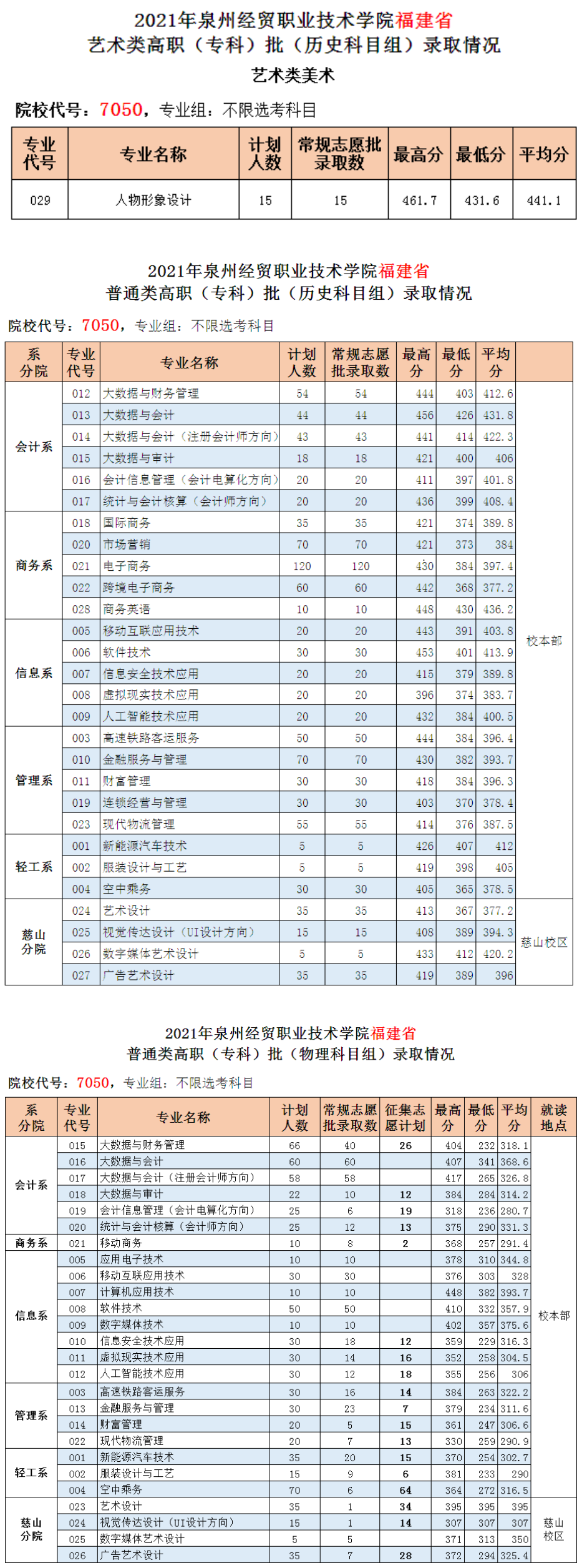 1、2021泉州经贸职业技术学院录取分数线【福建】