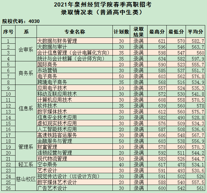 一、2021泉州经贸职业技术学院高职分类招考分数线