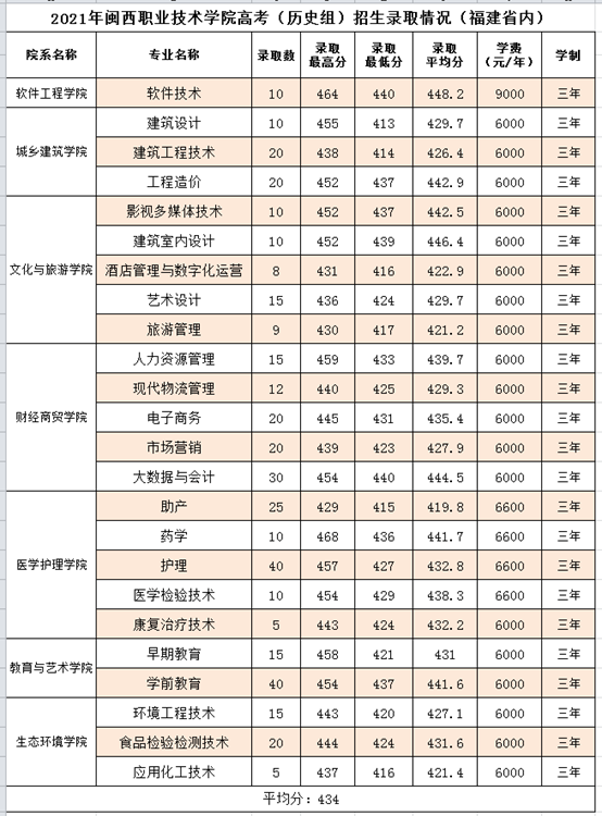 闽西职业技术学院2021年高考福建省内招生计划常规志愿一次性录满,物理组录取最高分449(本科线423),最低分310(去年293),平均分374(去年355);历史组录取最高分468(本科线467),最低分413(去年392),平均分434(去年427),录取分数再创新高。
