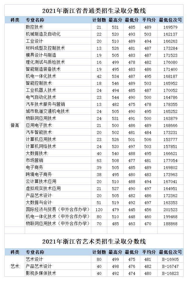 1、2021浙江机电职业技术学院录取分数线【全国】