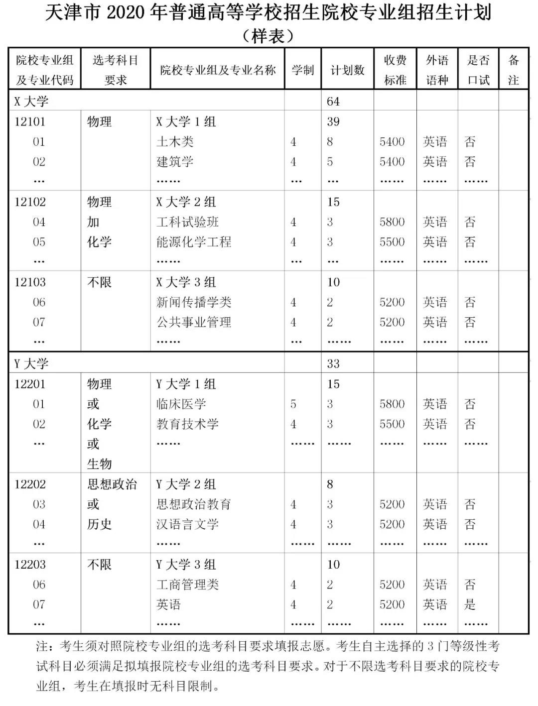 由于2020年各本科院校不同专业将提出相应的选考科目要求,且以院校专业组方式进行投档,因此各院校也要按专业组方式编制在津本科招生计划。院校在津公布计划总额须具体编制到各院校专业组,院校专业组的计划原则上须具体编制到组内各专业。招生计划样表如下表所示。