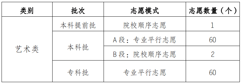 答:艺术类院校顺序志愿批次涉及艺术类本科提前批(设1个院校志愿)和本科批B段(设2个院校顺序志愿)。对艺术类本科提前批院校,将填报该校志愿且参加该校专业校考合格的所有考生,全部投档。对艺术类本科批B段院校,先将第一志愿填报该校且专业校考合格、文化成绩达到我市相应类别控制分数线的考生,全部投档;若未完成招生计划,再投档二志愿考生。