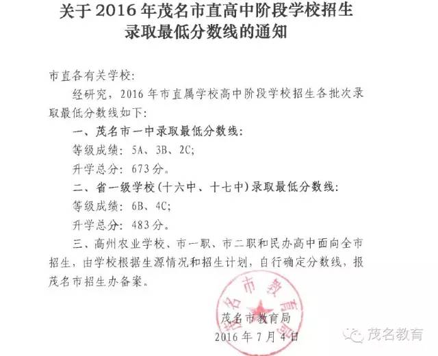 茂名市第十六中学和茂名市第十七中学招生最低录取分数线为483分,等级成绩为6B、4C。