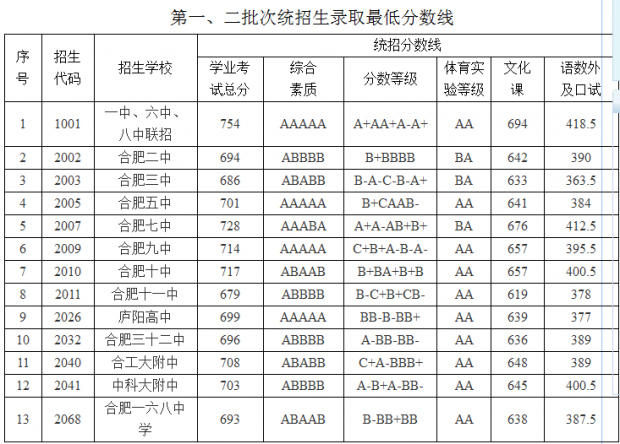 2016年合肥市区普通高中招生录取分数线公布。