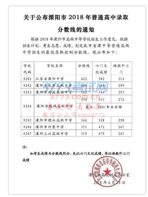 2018溧阳中考分数线(溧阳中学、光华高中、南渡、戴埠高中录取分数线)